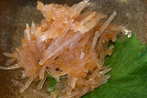 サメの軟骨を100%使用し、さわやかな酸味の梅肉で和えた梅水晶だ。軟骨の透明感が美しく清涼感あふれるところも魅力のひとつ。コリっとした軟骨の食感やプチっと弾けるようなトビウオの卵、梅肉のバランスが絶妙な美味しさだ。