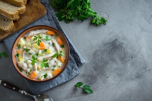 鶏肉を入れることで美味しい出汁が取れて、さらにボリュームもあるスープを作ることができる。鶏肉の皮は、好みによって剥がしたりそのままスープに入れてもよいだろう。