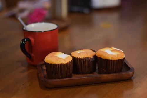 チョコレートシフォンケーキの生地をカップの8分目くらいまで入れて、空気を抜くために軽くトントンしてオーブンで焼く。焦げてしまうことがあるので、様子を見ながら必要であればアルミホイルを被せるとよい。