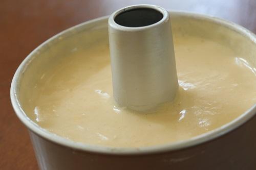 シフォンケーキの型は17cmか18cmが家庭のオーブンに入りやすく、家族4人分の分量のできあがりとなり、使いやすいだろう。