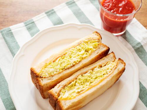 サラダ以外の方法でキャベツの生食を楽しむなら、主食にもなるサンドイッチの具材にするのがおすすめだ。サンドイッチなら腹持ちがよく、片手でも食べられるので子どもでも食べやすい。材料はキャベツ、薄切りの食パン2枚、スライスチーズ、ハム、マヨネーズだ。