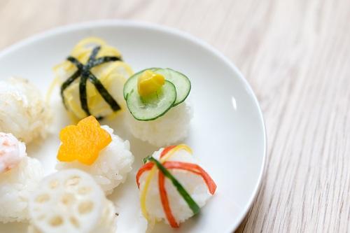 また、桜の花の塩漬けを使えば、桜の花びらそのものを寿司ネタにすることもできる。桜の花の塩漬けは、通販などで入手可能だ。寿司飯だけをラップでくるくると丸め、その上にさまざまな具材をのせれば、キャラ弁のようにキャラ手まり寿司を作ることもできる。