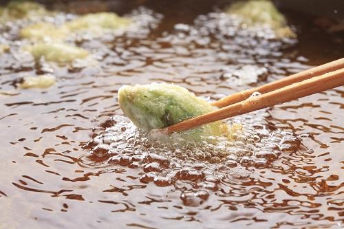 片栗粉をまぶすときは、茶こしで片栗粉をふるうか、ポリ袋にわらびを入れてその中に片栗粉を入れる方法がよいだろう。衣を混ぜ過ぎたり、わらびに水分が残ったりしていると、ベタッとした仕上がりになるので要注意だ。最後は、180℃の油で1~2分ほど揚げて完成だ。下処理済みのわらびは火を通し過ぎるとやわらかくなってしまうので、短時間で揚げるのがポイントである。