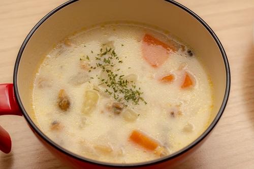 基本のクラムチャウダーは、あさりとにんじんや玉ねぎ、じゃがいもなどの野菜を牛乳で煮込んでいる。コンソメや小麦粉も入れるレシピもあるので、好みに合わせて入れるのもいいだろう。また、市販でクラムチャウダーのルウもあるので、料理初心者は利用するのもひとつの手だ。基本の作り方でもあさりの旨みを感じられるが、カレー粉やカレールウを入れてカレーチャウダーにするとスパイシーになり、よりあさりの旨みを引き立てる。具材を煮込んでから牛乳を入れるが、そのタイミングでカレー粉やルウを入れよう。カレー粉を使うときは、とろみをつけるため小麦粉を合わせて入れるようにする。最後に溶けるチーズを入れるのもいいだろう。