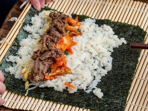 ツナ缶やカニカマ、ちくわなどは鉄板の美味しさ。肉の場合は、しっかりと火を通し、味をつけたものがいい。巻物になったとき、食べやすいよう細切れ肉などを炒めたものがおすすめだ。ニンニク、コチュジャン、酒、砂糖、醤油で味を付ける。時間がない場合は、焼肉のたれを使うと簡単。