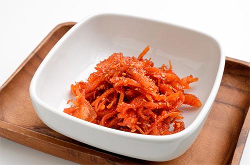 スルメキムチは韓国で人気のキムチで、さきいかやスルメを辛く味付けして作る。韓国では「チジュンオジンオキムチ」や「オジンオチェポックム」と呼ばれ、家庭でもよく作られている料理の1つ。作り方はとても簡単で、スルメにコチュジャンや水飴などで甘辛い味付けをするだけでOK。本格的なスルメキムチは水飴やコチュジャンのほか、ごま油や白ごまなどが使われている。