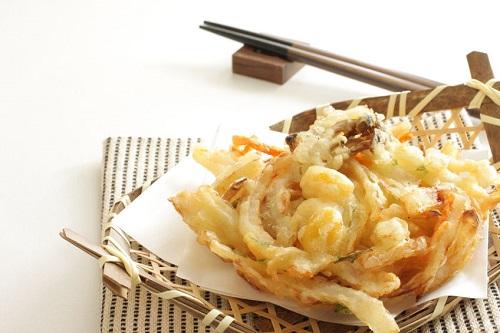 人参は千切り、玉ねぎは薄切りにしておく。ボウルにしらす・桜えび・切った野菜・天ぷら粉を入れて混ぜよう。別のボウルに天ぷら粉と水を混ぜ合わせ、そこに具材を加える。鍋の中で熱した油に、衣を混ぜた材料を箸と木べらで形を整えながらすべらせるように入れていく。表面が固まったら裏返して、ほんのりと色付きカラッとするまで揚げると完成だ。