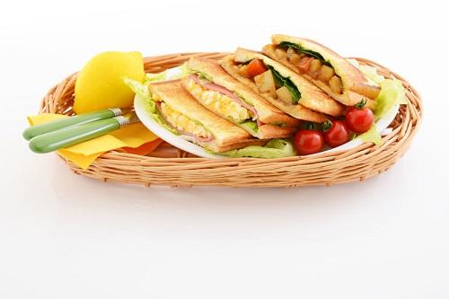 コーンスープに合わせる朝食としておすすめなのが、さまざまな食材を挟んだホットサンドだ。レタスやトマト、ハムやベーコンをパンにサンドして食べることでバランスのよい朝食になる。