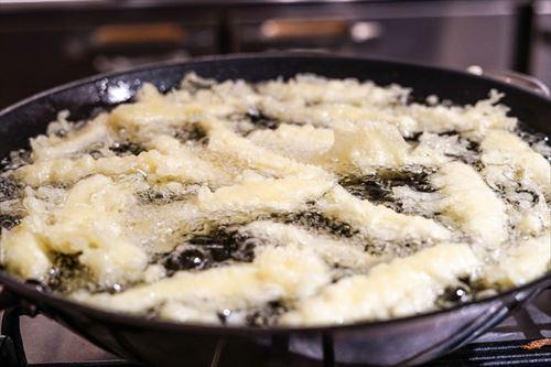 チータラを水で溶いた天ぷら粉につけて、180℃の油でキツネ色になるまで揚げればできあがり。
