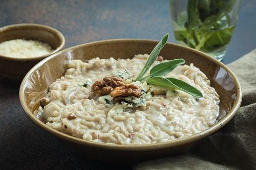 リゾットのレシピは水とコンソメスープの素を鍋に入れて火にかけ、沸騰したら塩こしょうで味を調え、弱火にし火にかけておく。別の鍋にオリーブオイルと玉ねぎを入れてしんなりするまで炒める。米を洗わずに加えて割れないように木べらで混ぜながら、玉ねぎにからめて炒める。米の色が透き通ってきたら、スープを少しずつ加えながら15分ほど煮る。最後にゴルゴンゾーラ・ピカンテとパルメザンチーズを加えてチーズが溶けるまで混ぜ合わせ、器に盛り付けて黒こしょうをふれば完成だ。