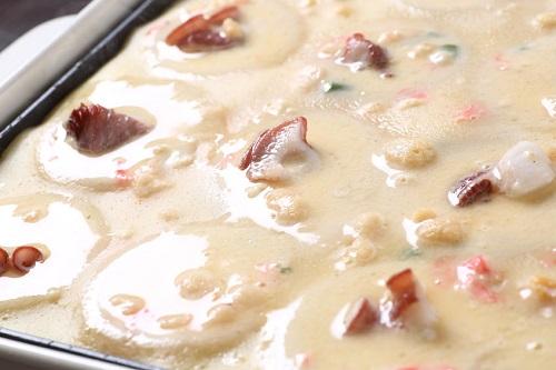 たこ焼き生地がダマになりにくいコツは、卵と水を先に混ぜたあとで、粉を2~3回に分けて入れることだ。5mm程度のダマは時間が経てばなくなるので、気にしなくてもOK。生地を一晩冷蔵庫に入れ寝かせると、焼いたときのとろとろ感が増す。