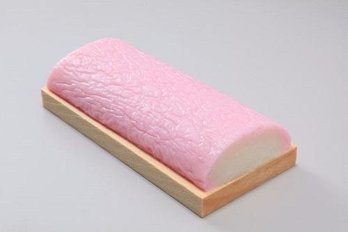 最後に板から外せば、美しい飾り切りの完成。両面に模様が付くため、どの向きで皿に並べてもキレイな模様がしっかり見える。板から外したあとにスライスしてもよいが、かまぼこが安定せずにカットしにくい。板に付いたままでカットし、最後に外したほうがキレイな模様に仕上がるだろう。白いかまぼこでももちろん作れるが、ピンク色のほうがより美しく華やかな仕上がりになっておすすめ。