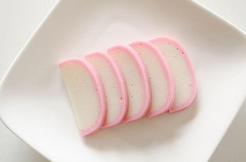 ピンク色のかまぼこのピンク色の部分に、中心部分を1cmほど残して左右から切り込みを入れる。ピンクの部分を左右から中心に向かって丸め、ピンなどで刺して固定すれば完成。丸い飾りが付いたピックなどで固定すると、よりリボンらしい仕上がりになるだろう。
