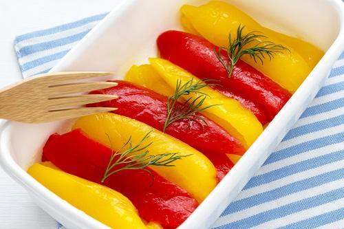 パプリカはヘタと種を取り除いて1.5cm幅くらいの細切りにし、たまねぎは薄切りにして水にさらす。耐熱皿にパプリカを広げて並べ、レンジで600W3分ほど加熱する。密閉できる保存容器にパプリカと水気を絞ったたまねぎを入れ、マリネ液をまわしかけて冷蔵庫で味がなじむまで1時間程度冷やしたら、完成となる。赤色と黄色のパプリカがとても鮮やかなマリネが完成する。たまねぎはきちんと水にさらして辛みを取っておくことが重要である。