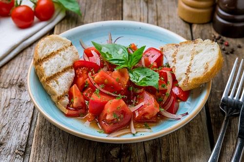 自家製ドレッシングは、オリーブオイル、酢、塩、挽いた胡椒をベースにシンプルに作ることができる。このドレッシングにみじん切りにした玉ねぎを加えると、生のトマトにマッチするドレッシングが完成する。夏ならばレモンを加えても清涼感が生まれる。みじん切りにした玉ねぎをトマトの上にトッピングし、自家製のドレッシングをかけても同様の味わいとなる。