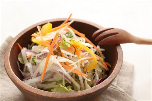 明太子は味の濃い食材のため、大根などの淡白な味わいの野菜と相性バツグン。まずは大根を千切りにし、全体に塩をまぶしてもみ込む。10分程度置いたらギュッと絞って余分な水分を取り除いておく。そこにほぐした明太子とマヨネーズ、好みで大葉や刻みのりを加えて和えれば完成。大根を塩もみせずにサラダにしてしまうと、明太子やマヨネーズを和えたときに水分が出て水っぽくなってしまうので注意しよう。また、塩は全体に軽くふりかける程度でOK。あとから塩抜きするわけではないため、塩辛くなりすぎないようにするとよい。サラダの具材は大根のほか、同じく千切りにしたニンジンやカイワレ大根も人気。野菜と明太子だけでは物足りない場合は、ツナなどを加えてボリュームアップさせるのもおすすめ。