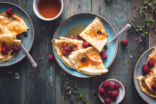 卵・牛乳・砂糖を混ぜて作った卵液に、2枚重ねた春巻きの皮を浸す。しっとりしてきたら、バターをしいたフライパンで両面焼けばもっちりとしたクレープの皮が作れる。好みのフルーツやソースをのせて楽しもう。春巻きの皮が中途半端に残ってしまったときにもおすすめのアレンジだ。