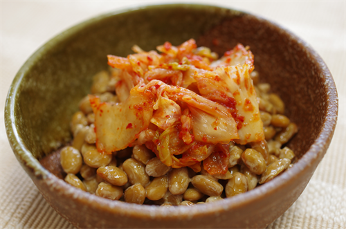 クセが強いイメージのあるキムチもイカ塩辛納豆と相性がよい。それぞれの主張が強いように感じるが、合わせてみると意外と好相性でつまみにも最高の組み合わせだ。さらに、好みで焼き海苔やごま油を足してみるのもおすすめだ。