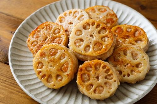 鶏ひき肉と蓮根で作る、シンプルなフライパン焼きもおすすめだ。蓮根に片栗粉をつけると接着剤のような役割をしてくれ、ひき肉と蓮根をしっかりくっつけることができる。ヘルシーながらボリュームがある献立だ。
