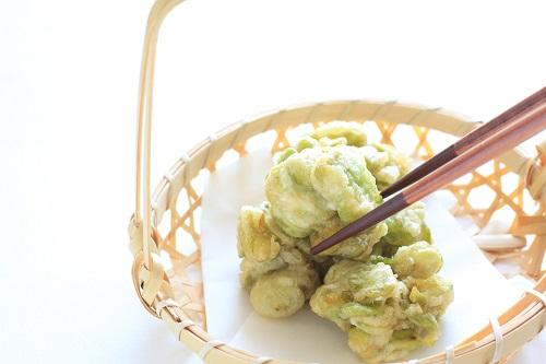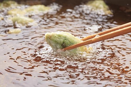 こごみの天ぷらをカラリと揚げる調理のポイントは、天衣を付ける前に薄力粉をまぶすこと。なぜなら薄力粉が接着剤の役割を果たすので、均一に衣が付くからだ。さらに揚げているときに衣がはがれにくく、こごみの旨みを逃すことなくカラリと揚がりやすい。ちなみに天ぷら粉を使用して作るこごみの天ぷらのカロリーは1人前で160kcal前後だ。