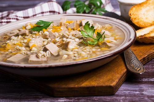 押し麦はさっと洗ってから、ザルにあげ水気をきっておく。鶏もも肉は1cm角にカットして、ベーコンは千切り、セロリは斜めにスライス切りにしておく。さらに、かぶ、にんじん、じゃがいもはいちょう切りにしておく。鍋にサラダ油を熱して、鶏肉とベーコンを入れて炒めてから、たまねぎ、セロリ、にんじんを加えて炒めていく。水、コンソメブイヨン、じゃがいも、押し麦を入れて煮ていき、少ししてからかぶといんげん豆水煮を入れてさらに煮込んでいく。押し麦がやわらかくなったら、塩コショウで味を調えて完成となる。