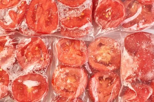 トマトを適当な大きさに切ってから冷凍すれば、少しずつ使うことができる。また、使いやすい大きさに切っておけばそのまま調理に使うこともできる。切ったトマトは密閉できる袋に入れ、平らにしてから冷凍庫に入れる。平らにしておけば料理のときに必要な量だけ取り出しやすくなる。
