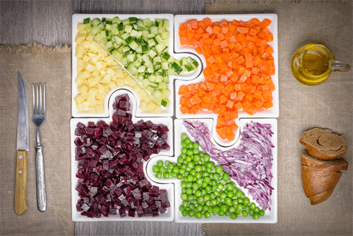さいの目切りは、角切りの一種で1cm角程度の小さなサイズがポイント。見た目の美しさとともに火の入り具合も均一になるので、できる限り、同じ形に切り揃えられるようにしたい。上手に行うポイントは、手入れされた刃物を使うこと。さらに一度にたくさん切ろうとしないで、丁寧に切りそろえること。マスターしてサラダやスープの具材に使ってみよう。