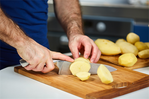 じゃがいものさいの目切りは、まず洗って皮をむき、芽を取り除いておく。方向はどちらでもいいが、1cm幅になるようにカットする。この状態ではまるい、いわゆる輪切りの状態。これをさらに1cm幅の短冊切りにして、90度回転させて端から1cm角にカットすればできあがり。水にさらすと表面のデンプンが落ちるので、料理に合わせた下ごしらえをしよう。