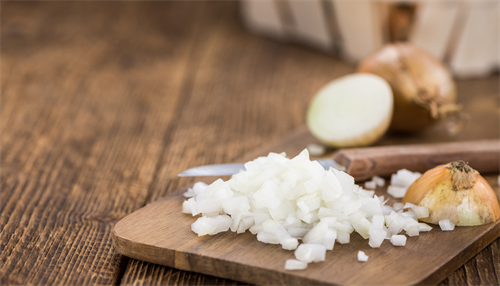 玉ねぎのさいの目切りは、まず皮をむいてヘタとひげ根を切り落とす。半分に切ったら、根元を少し残し、繊維に沿うよう縦1cm幅に切り込みを入れる。90度回転をさせて、次は厚みが1cmになるよう横に切り込みを入れる。最後に端から1cm角になるよう切り揃える。端の残った部分は、横に倒して縦横1cm幅に切り揃える。