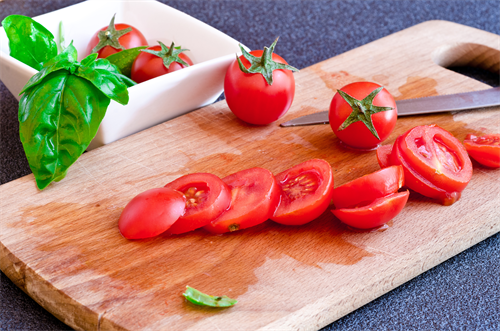 トマトのさいの目切りは、まず洗って包丁やぺティナイフの刃先でヘタをくり抜いておく。まずはトマトを横にして、1cm幅の輪切りにする。1または2枚ずつ重ねて縦横1cmの幅に切りそろえれば完成。トマトは切れ味の悪い刃物を使うと潰れてしまうので、手入れされた包丁やぺティナイフを使うのが正解だ。