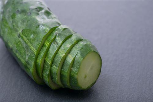 ジャガイモはメークインのような縦長のほうがやりやすい。きゅうりは半分に切ってもいい。 - 素材を横にしておき、斜めに包丁を入れ、回しながら切り込みを入れていく。