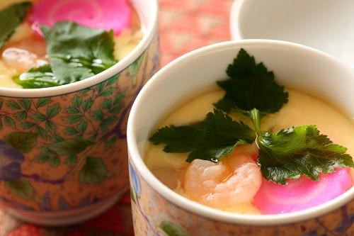 卵の3倍の量の出汁をかき混ぜた卵に加えて、塩を少々入れて、かき混ぜたあとザルでこす。鶏肉・かまぼこ・しいたけなどの好みの具材を耐熱容器に入れて、上から静かに卵液を流し入れる。アルミホイルでフタをして、蒸し器で10分加熱したら完成だ。