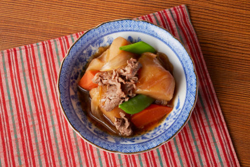 すき焼きのタレを使ったアレンジ料理の代表が、肉じゃがである。材料を切って油で炒めるまでは、基本の作り方と同じ。水を加えて材料を煮込み、食材がやわらかくなったらすき焼きのタレを加えて味付けが完成する。すき焼きのタレだけで味付けをすると少し濃い味になってしまうので、あらかじめ水だけで材料を煮込んでおくのがポイントである。