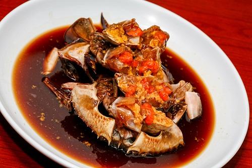 ワタリガニはブラシなどを使用して擦り洗いし、甲羅の裏や足の付け根の汚れを落としておく。次に水、醤油、みりん、酒、昆布を鍋に入れてひと煮立ちさせ、冷めたら玉ねぎ、長ネギ、にんにく、しょうがを入れたタレにワタリガニを漬け込み、冷蔵庫で3日ほど熟成させるのだ。