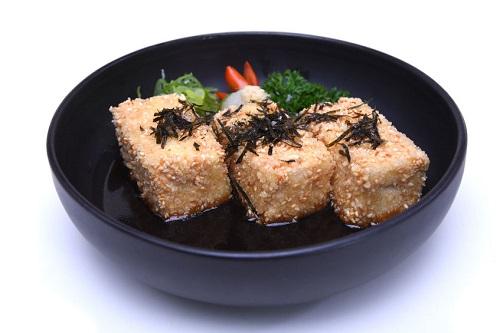 豆腐にクリームチーズを挟んで揚げるというアレンジ。チーズのコクとうまみが加わり洋風テイストで、つまみとしてもいける。