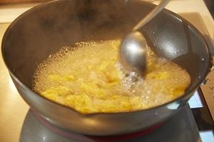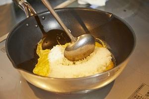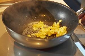 ③フライパンに溶き卵を入れ、ゆっくり混ぜる。半熟になったところで、すかさずごはんを入れる