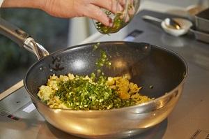 ⑤ニラを入れ混ぜ合わせ、香りが立ってきたら一旦ボウルに取り出し、ラップをする