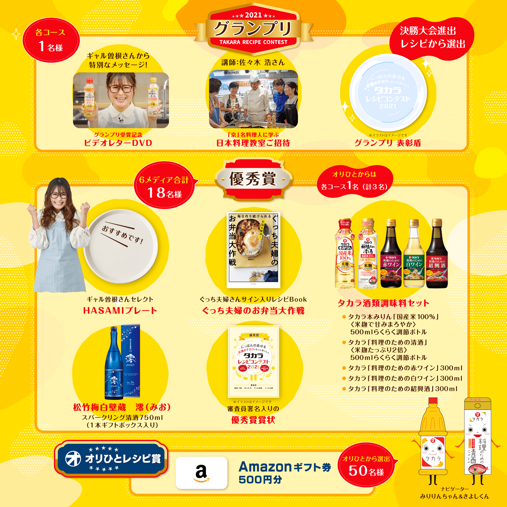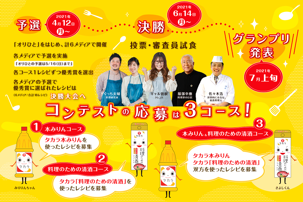 「オリひと」をはじめ、計6メディアで開催する今回のレシピコンテストでは、まず各メディアで予選を実施する。上記3コースを設置し、オリひとからは、各コース1レシピずつ優秀賞が選出される。その後、各メディアの予選で優秀賞に選ばれたレシピ(6メディア合計18レシピ)は決勝大会に進み、タカラレシピコンテスト公式サイト上で実施される一般ユーザーによるWeb投票と豪華審査員4組による試食審査により、栄えあるグランプリ(各コース1レシピ、合計3品)が決定する。