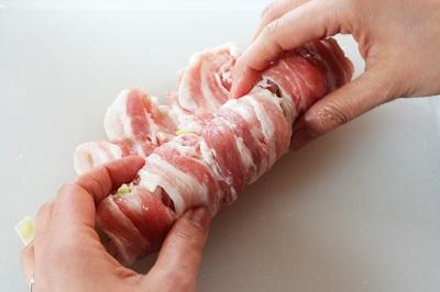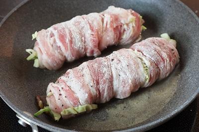 2.豚肉に塩・こしょうを振る。「1」をのせてしっかりと巻く