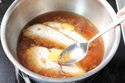 4.鰆(さわら)を器に盛り、煮汁を煮立たせ、上にかけたら完成