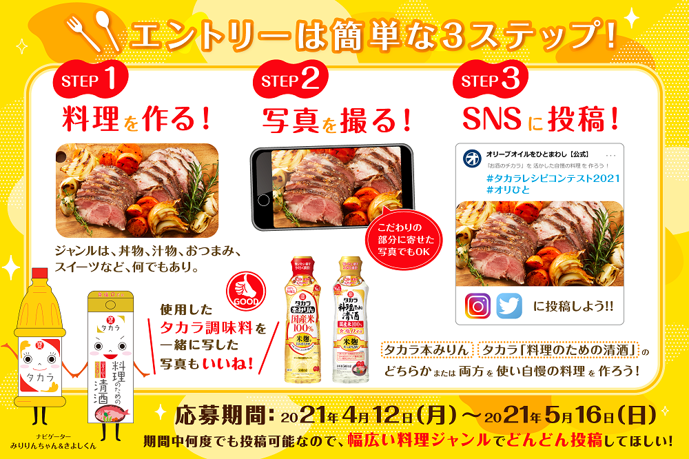 「タカラレシピコンテスト2021」がついにスタートする。まずは"タカラ本みりん"と"タカラ「料理のための清酒」"を実際に使って、その効果を体感してみてほしい。そして両品を存分に生かしたあなたのこだわりのレシピを作り、投稿しよう。「オリひと」で開催する予選の投稿期限は、2021年5月16日(日)迄だ!あなたの力作を待っているぞ!