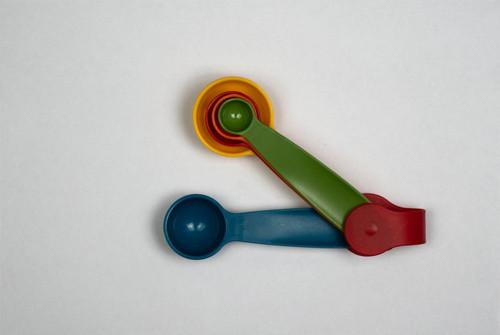 計量スプーンは体積で計測する調理器具であり、「小さじ1=5ml」「大さじ1=15ml」として量ることができる。しかし「体積=質量」ではないため、必ずしも「小さじ1=5g」「大さじ1=15g」という関係が成り立つわけではない。料理本やレシピサイトなどに「小さじ〇」「大さじ〇」と書いてあったら、キッチンスケールではなく、なるべく計量スプーンを使って量るようにしよう。