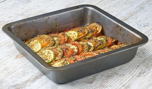 トマトとズッキーニの上に、チーズではなくハーブをかけて焼くと、風味のよいオーブン焼きができる。パセリ、タイム、にんにくとオリーブオイルを全体にかけて、180℃のオーブンで25分ほど焼けば完成だ。薄切りにして炒めた玉ねぎやナスを加えるとより美味しい。