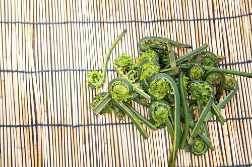 次にぜんまいと比較してみよう。ぜんまいに含まれるビタミンA(β-カロテン)の量は100gあたり500μgだ。ビタミンB群は、B2が0.09mg、B6が0.05mg、ビタミンCが24mg、ビタミンEが0.7mg含まれている。ミネラルはカルシウムが10mg、マグネシウムが17mg、カリウムが340mgと多く含まれている。比較してみるとB6以外は、ぜんまいよりこごみのほうが多く含まれていることが理解できるだろう。こごみは同じ山菜の中でも、栄養を多く含んでいることがわかる(※1、※3)。