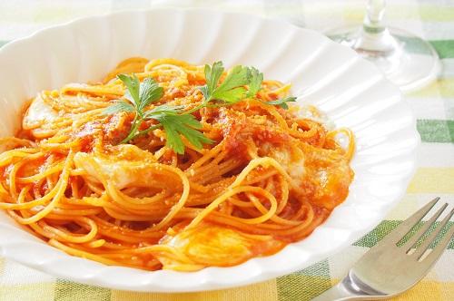 モッツァレラは1cm角の大きさに切っておく。茹でておいたスパゲッティとモッツァレラをトマトソースが入ったフライパンに入れ、混ぜ合わせる。トマトソースの余熱でモッツァレラがほどよく溶ける。全体が混ざったら皿に盛り付け、バジルをのせれば完成だ。