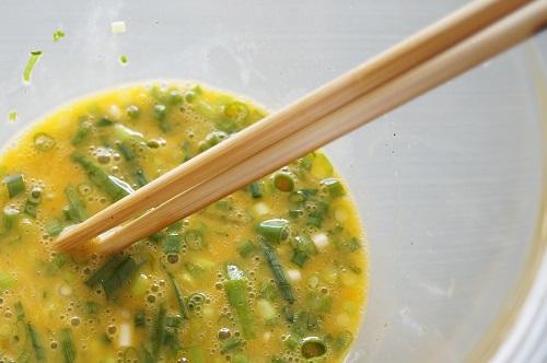 まずは、通常の卵焼きと同様に、生卵を割って溶く。そこに、みじん切りにした紅生姜を加えて混ぜる。濃い味が好きなら、さらに紅生姜の汁を加えてもよい。塩分が多く含まれるので、加え過ぎには注意しよう。