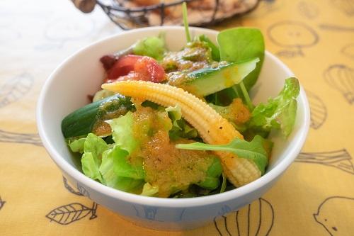 ヤングコーンとズッキーニのほかに、オクラやナスなどの夏野菜を用意する。オリーブオイルをひいたフライパンで、焼きめを付けるように焼きつけ、塩をふる。ボウルにサニーレタスやベビーリーフ、トーストしたフランスパン、焼いた野菜を盛り付け、醤油とはちみつ、オリーブオイル、酢で作ったドレッシングをかけたら完成。ボリューム満点のサラダは、ランチや軽食にもおすすめしたい。