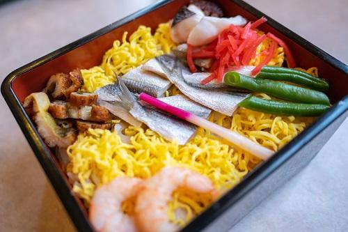 岡山県の郷土料理、バラ寿司にはままかりの酢漬けが欠かせない。酢漬けにしたレンコンや茹でておひたしにした青菜、サヤエンドウ、甘辛く味付けた椎茸、茹でエビ、錦糸卵などと一緒にままかりの酢漬けを散らせば完成だ。