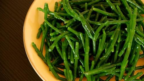シーアスパラガスは沸騰した湯で1分茹でてから、水に30分~1時間程度浸して塩抜きする。フライパンにオリーブオイルをひいて、しめじを炒める。しめじに火がとおったら、シーアスパラガスを加える。塩とブラックペッパーで味を調えたら、完成となる。シーアスパラガスはもともと塩味が強いので、塩は少なめにしておく。