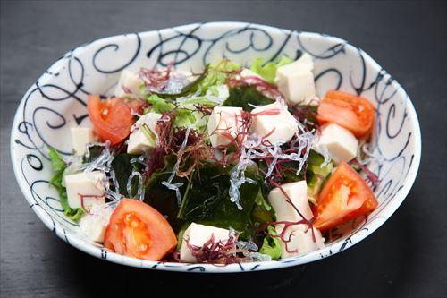 わかめのサラダに豆腐とレタスを加えれば、焼き肉屋さんでよく見かける豆腐サラダが完成する。木綿豆腐を使うことで、ボリュームがアップするだろう。